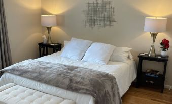 The light, airy kitchen/ living room area is an open concept. The kitchen has white quartz countertops, new stainless steel appliances, and a stocked coffee bar with a Keurig coffee maker. The living room boasts a large comfy sofa, a Smart TV, and an electric fireplace to add to the coziness. There is a large deck off the living room with outdoor furniture, an umbrella to shield you from the sun, and a gas grill. The primary bedroom has a king-size, adjustable bed. You can raise the head of the bed to get a better look at the 65-inch Smart TV and electric fireplace. The second bedroom upstairs has a queen bed. A third bedroom downstairs on the lower level has a king-size bed. You can access the downstairs patio and yard from the downstairs bedroom. The full bathroom has a tub/shower and an LED-backlit, antifog bathroom mirror perfect for makeup, shaving, and hair drying. There is hardwood throughout, central a/c., Wifi (300 Mbps -up to 5 devices), and a full-size washer and dryer. There is off-street parking for two cars in the driveway.