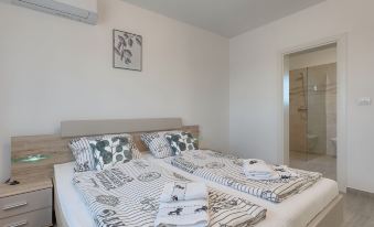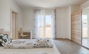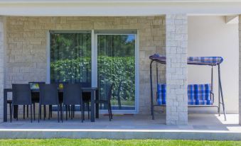 Nova Vas 6 km from Poreč: Beautiful single-family house "Villa Zirdum", 2 storeys, built in 2019. 300 m from the centre of Nova Vas, in a sunny position, 4 km from the sea, 4 km from the beach. Private: property 600 m2 (fenced), garden with lawn, swimming pool angular (8 x 4 m, depth 150 cm, seasonal availability: 01.May. - 15.Oct.) with internal staircase. Outdoor shower, garden furniture, barbecue. In the house: internet access, washing machine. Parking (for 3 cars) at the house on the premises. Supermarket 400 m, restaurant 500 m, bus stop 4.1 km, pebble beach 4 km, rocky beach 4 km, public bathing area 4 km. Tennis 5 km, riding stable 7 km, walking paths from the house 100 m, cycle lane 150 m. Nearby attractions: aquapark 10 km, amusement park 15 km. Please note: suitable for families. Youth groups are not allowed. 4-room house 150 m2 on 2 levels. Tasteful furnishings: living/dining room 28 m2 with satellite TV (flat screen), air conditioning. Exit to the terrace. 1 room with 1 double bed (2 x 90 cm, length 200 cm), satellite TV (flat screen), air conditioning. Open kitchen (oven, dishwasher, 4 ceramic glass hob hotplates, microwave, freezer, electric coffee machine). Shower/WC, shower/bidet/WC. Upper floor: 1 room with 1 double bed (2 x 90 cm, length 200 cm), shower/bidet/WC and satellite TV (flat screen), air conditioning. Exit to the terrace. 1 room with 1 double bed (2 x 90 cm, length 200 cm), shower/bidet/WC and satellite TV (flat screen), air conditioning. Forced-air heating. Terrace 20 m2, roofed, terrace 6 m2. Terrace furniture, deck chairs. View of the garden. Facilities: safe, iron, hair dryer. Internet (WiFi, free).