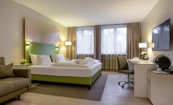 The Congress Hotel Mercure Nuernberg an der Messe is just a short walk from the exhibition center. The hotel offers 140 rooms with air conditioning and free WIFI as well as a sauna and fitness area. For your events for up to 200 people, the hotel has six quiet meeting rooms facing the park. The hotel is 1.9 miles ,3 km from the main train station and 7.5 miles, 12 km from the airport. The nearest highways are the A3, A6, A9 and A73 and the hotel offers parking. Travel to the city in 10 minutes by U-Bahn.