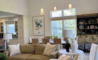 Designer Finishes. Beautiful home has everything a retreat has to offer. Main level, has open concept with a stunning living room, TV, dining area and a well equipped gourmet kitchen with gas range, stainless steel appliances, granite countertops. Separate sitting room with TV and pocket doors for privacy. Screened porch with additional dining space and outdoor deck with lounge furniture, grand umbrella and grill.
