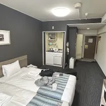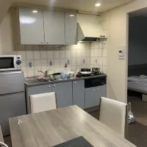On the downside, service was minimal; we had to take out our own trash, and the front desk only operates until 10 PM. The bed was also quite small. However, the room was well-equipped with kitchenware and featured a balcony, which was great for drying clothes. The space was also decent, allowing us to easily open two large suitcases. The surrounding area is incredibly convenient, with plenty of great dining options, and easy subway access makes getting around a breeze. This place is ideal for anyone looking to cook their own meals.