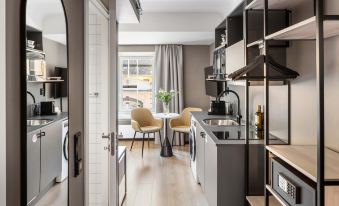 Highly recommended. The hotel is part of an old post office, located right behind a bus stop, 100m from a tram stop and 500m from Oslo Central Station. There are restaurants just downstairs or nearby. The room is large enough and well-equipped, with a washing machine, a big drying rack, a microwave and all utensils. There is a public room for (self-service, super convenient, pretty large space) luggage storage facilities and all the necessites (tea packs, towels, linens, and ear plugs etc., though it is quiet at night) Everything is done on app, including check-in/out and opening the doors.