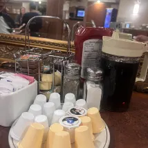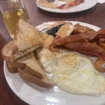 The basement restaurant is spacious and the food is standard, though the prices are very high for what you get; there's a nice breakfast restaurant across the street for better value.