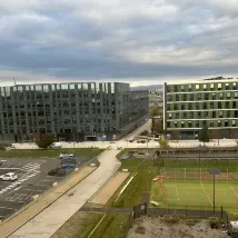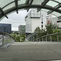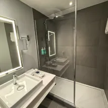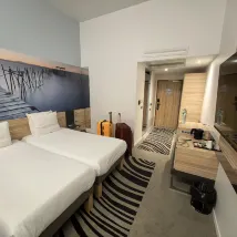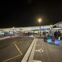 It's a decent hotel with a spacious room. The breakfast is a standard Novotel breakfast and is quite good. Let me explain how to get to the hotel from the airport. After arriving at Orly, find the bus station and the green bus icon in the middle. You should wait for the bus at platform D2. Then get off at Coeur d'Orly. The hotel is located just past the Ibis Hotel and around the station.
