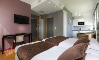 Our priorities were proximity to a Metro transit hub on the Rive Gauche and to Gare du Lyon, as well as an elevator and a kitchenette. The afternoon and night staff were attentive and pleasant. The hotel housekeeper was excellent. The daytime front desk staff (middle-aged gentleman) had plenty of excuses to not respond to our needs during our visit. I looked up the Hudson induction cooktop on YouTube to figure out how to use it. Unlock it by pressing key icon for several seconds if it shows “Lo” after you turn it on. The shower floor is not separate from the bathroom floor, with no shower curtain, so it takes some skill to not get the whole bathroom wet when using the shower. The room heating controls cannot be adjusted. The terrace in the hotel photo is probably only accessible by one of the hotel rooms!