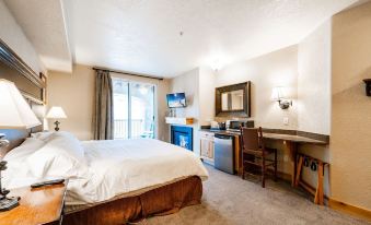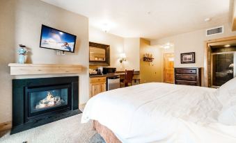 The bedroom(A) has a king bed, a small kitchenette come with mini fridge, microwave & coffee maker, a bathroom, a gas fireplace, and more.