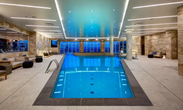 Stein Eriksen Residences offers a heated indoor-outdoor infinity pool, hot tubs, expanded fitness center, several terraces with fire places, on-site restaurant serving breakfast, lunch and dinner, on-site business center and full-service spa.