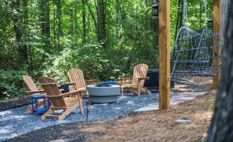 ☀ Private backyard surrounded by forest greenery, firepit, grill and outdoor seating