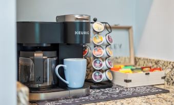 ☀ Kitchen is fully equipped with appliances including a large fridge, stove, and a Keurig coffee maker