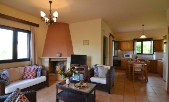 Christina Villa has an architecture inspired from the local traditional aesthetics. The private pool adds to the characteristics of the discreet luxury and decorates the nights of the veranda. Large open plan lounge with integrated dining area, a fireplace and full equipment, complete the comfort and relaxation that the guests enjoy when they do not choose to gaze and wonder at the mountain view, tapestry of olive groves and vineyards..