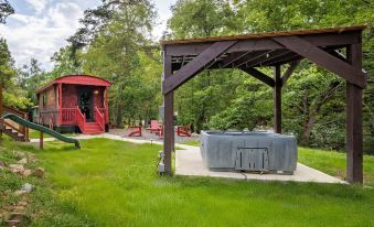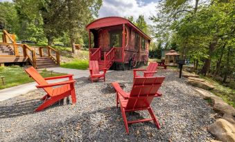 This wagon is 200 sq feet with an open floor plan (studio style) with a comfortable Queen bed on the top bunk and Full bed on the bottom. There is 1 full bathroom (stocked with towels, washcloths, and toiletpaper), a kitchenette with a small refrigerator, toaster, toaster oven, sink, and microwave. Dishware, glasses, silverware, basic cooking ware, over fire pots and pans, serving ware, grilling equipment, and a Keurig with a handful of K-Cups are included. A TV with a DVD player only are included in the cabin. Outside you can find a park style charcoal grill for cookouts during your stay (charcoal not included) as well as Adirondack chairs facing the creek. Wifi is NOT included in the cabin.