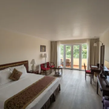 The rooms are spacious and clean, with lush green views and a large swimming pool. The food is varied, offering plenty of options.