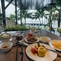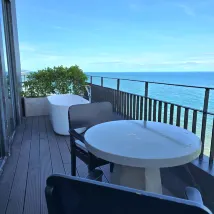 We arrived at Phu Quoc Airport at around 6:30pm, the hotel has free shuttle bus pick-up in airport, but it is no longer available after 6pm. I hope the hotel can consider re-arranging the airport pick up time, because most flights arrive in the evening or at night. So, that time we paid in advance to arrange private car transfer to the hotel. We chose to stay at M hotel Rooftop Ocean View Suite on our first night, the room has sea views on both sides of the window, and the terrace has a table and stools, as well as and an open-air bathtub. Overall feeling is good, and the location is very close to night market, just only around 8min walk. Just only breakfast buffet has few choices.