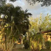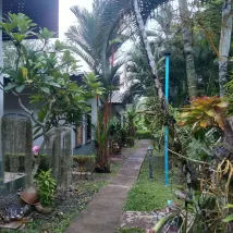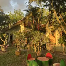 Hotel Facilities: The hotel has a rustic resort style, consisting of several single-story, independently built units. Lush greenery, trees, flowers, and fish ponds are planted between the houses, creating a vibrant, natural ambiance.