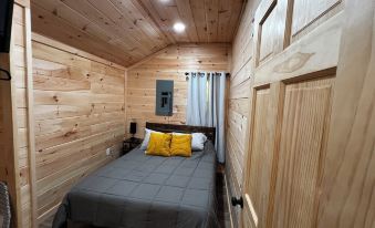The cabin features a comfortable bedroom with a queen-size memory foam mattress, ensuring a restful night’s sleep after a day spent exploring or relaxing in nature. This cabin also has a full-size futon in the living room, equipped with one of the top-rated mattresses for futons, ensuring extra comfort and quality sleep for additional guests. The living space is thoughtfully designed to combine country charm with convenience, offering all the essentials you need for a perfect stay.