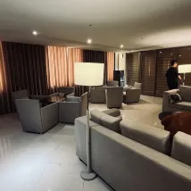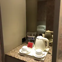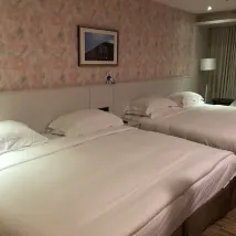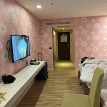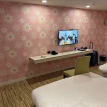 There is no cigarette smell in the room. It is clean and has simple things. There is Mickey and Minnie in the lobby to celebrate the New Year and there are candies 🍬. The waiter is a boy. He is very nice and kind. After asking, he will provide extra quilts to cover the elders at night.