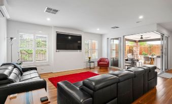 There are two spacious living areas, each with a large 75 inch Sony TV. The main living area includes an elegant kitchen with an oversized island bench, double sink, generous cupboard space and supplies. The electric recliner couches in the main living area are adjacent to large sliding doors which open up to a relaxing alfresco area. The alfresco area has an 8 seat concrete table and outside kitchen/Weber, which is perfect for outside dining.