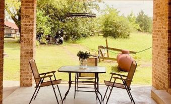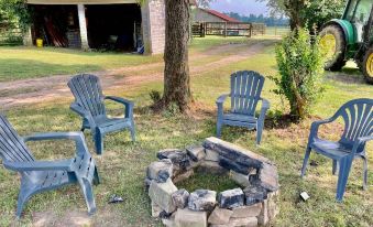 The farmhouse has a fully stocked kitchen when you first walk in, with a bar and stools instead of a dinning area. Close by is a coffee station with all the fixin's. The living room has a couch and a sofa with 4 recliners. There is a Roku TV where you can stream TV subscriptions, such as Netflix and Hulu, or there is a DVD and VCR player attached where we include family-friendly movies. Each bedroom comes with one bed, 2 of them have full sized beds and the third has a queen sized bed. Main area has a couch, recliners and room for an air bed. There is plenty of closet space in each room as well. Also the living room is spacious enough for a blow up bed for guests to bring along. Both bathrooms include a shower and the utility room has a fully functioning washer and dryer. Walk out the door and you have the option of a shaded patio with furniture, a fire pit and a charcoal grill. We also provide an outdoor dog pen for any large or outside dogs.