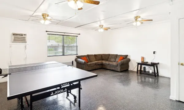 The Game Room includes various board & card games, an Olympic-sized ping pong table and 2 couches; with one that can be easily converted into a full-size bed. This couch can sit 3 people. The larger couch can fit 4-5 people.