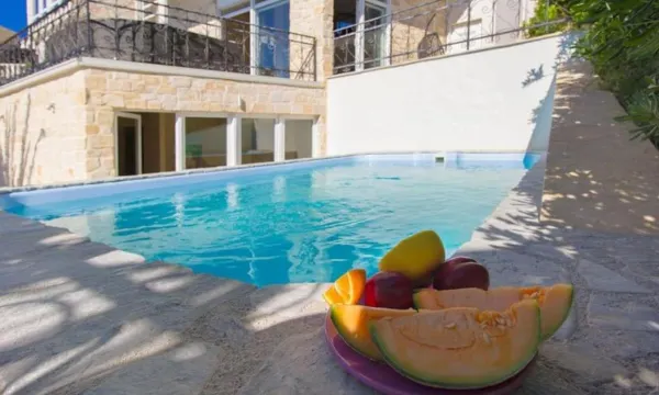 One of the highlights of Villa Jasmin is its expansive terrace, which offers panoramic views of the Adriatic Sea and the surrounding landscape. This outdoor space is perfect for sunbathing, enjoying a morning coffee, or dining al fresco as you watch the sun set over the horizon. The terrace is complemented by a private pool, where guests can cool off while taking in the mountain views, and a sauna for ultimate