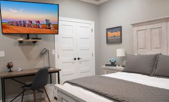 The bedroom has a lovely farm house feel and offers a queen size memory foam bed with ample plush bedding & a variety of pillows. There are nightstands with lamps on each side of the bed. There is a 55" Smart WiFi TV mounted on the wall with an articulating mount and DVD player. The TV has all the local channels & Netflix. There is a desk with a work area for a laptop or conducting business. You can also or enjoy the sofa for relaxing or watching a movie.