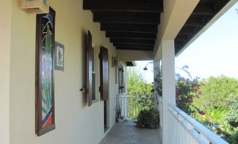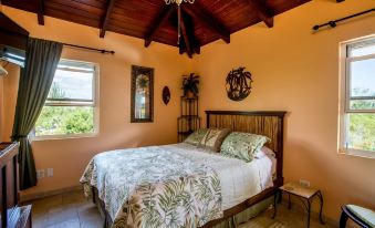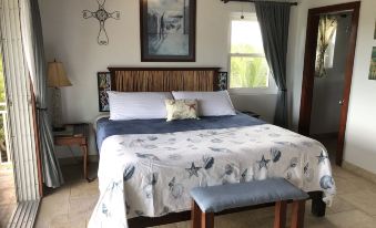 The accommodations are the main house with a private swimming pool and wrap around deck, all on the second floor. The villa has two bedrooms with 1 king and 1 queen size beds. Each bedroom is air conditioned. The lookout room on the third floor has a full size bed. but is not air conditioned. Has a ceiling fan and windows on two sides which provide a nice breeze. The well equipped kitchen and living area have views of Taylor Bay,