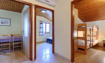 3-family house "Ruža". 500 m from the centre of Valdebek, 4 km from the centre of Pula, 5 km from the centre of Medulin, 4 km from the sea, 4 km from the beach. For shared use: property 600 m2 (fenced) with plants and trees. Terrace, garden furniture, barbecue. In the house: internet access. Parking at the house on the premises. Shop 400 m, supermarket 4 km, bus stop 30 m, sandy beach 5 km, rocky beach 4 km. Marina 4 km. "Ruža 1", 3-room apartment 50 m2, on the top floor. Living/dining room with satellite TV and air conditioning. 1 room with 2 beds. 1 room with 1 x 2 bunk beds. Open kitchen (2 hot plates, oven, 2 gas rings, toaster, kettle, microwave, electric coffee machine). Shower/WC. No heating option. Facilities: iron. Internet (WiFi, free). Please note: non-smoking house. Private entrance.