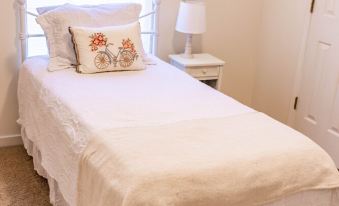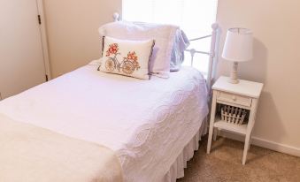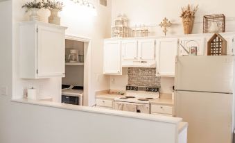 This charming two-story home has been newly redone with a white, bright farmhouse meets Shabby chic style. It has two bedrooms and one full bathroom downstairs. The upstairs has a king size bed and a full bathroom.