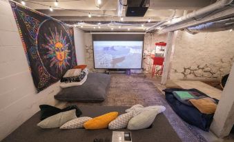 • Home cinema set up with big lounge bean bag chairs & cozy sleeper floor couch