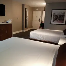 The beds and pillows were very comfortable. However, the bathroom had not been cleaned properly, as there was hair and soap residue everywhere. The bath tub had no grab bars and you had to get all the way in the shower to turn on water. There was no shower mat to help keep you from sliding (remember, no grab bar). No shower caps or lotion. The restaurant was a very pleasant experience, both the staff and food were great!