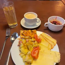 The breakfast was very good and we enjoyed the variety of food brought out both mornings. They had hot items which changed a bit each day and included an egg omelette, bacon, potatoes, a Latvian pancake and sausages. There was a good spread of cold items too and we are sure a vegetarian would be satisfied with the offerings of vegetables, cheeses, devilled eggs and fruit. The coffee machine made a very good hot chocolate and they also provided juice and water with breakfast. There is a bar behind the check in counter that is open to hotel guests and a nice seating area in the lobby too if you're looking for something more later.