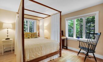 Off of the kitchen is a bedroom with a queen-size bed and an adjoining full bathroom. Rounding off the tour of the first floor is an oversized mudroom with ample space to store your active gear (skis, rackets, water sports, etc.) and a treadmill.