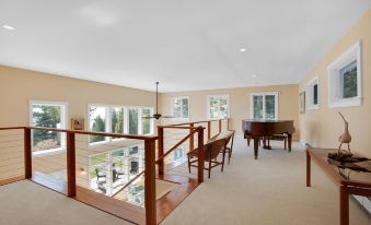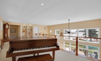 Returning inside, you take the stairs to the second floor, immediately noticing the Baldwin Grand concert piano that looks to the sea and may be played to entertain guests below in the architecturally soaring living room. Upstairs there are two bedrooms and a full bathroom with an adjoining laundry room. The first bedroom has two twin beds. The second is the primary suite. This suite has a king-size bed, stunning panoramic views of the outer islands, a full bath featuring a comfy tub for relaxing at the end of the day, and a large shower. A leather loveseat faces a flat-screen television and a writing desk positioned perfectly for nautical inspiration.