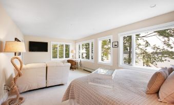Entering the home, you will note the maple flooring and how the ocean-facing windows brighten the open-concept living and dining areas with the sun. If you plan to stay in for the evening on a chilly night there is a propane insert fireplace, a 60" flat-screen television, and a comfortable selection of quality furniture from New England's finest artists and craftsmen. You will find no shortage of comfort and high quality at this vacation home. In this space, you will also enjoy the large dining room table which seats 12 with an expansive view of the ocean. Off of the living room, you enter a large contemporary kitchen with new major appliances, ample counter space, an island workspace for creating culinary delights, and bar seating for five at the attached mahogany counter. The kitchen has a standard drip coffee maker, a Keurig, and an espresso machine. Directly off the kitchen is an informal breakfast area, with a cozy wood stove for four.