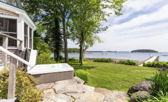 A cozy screened-in porch for rainy-day conversation sits adjacent to the deck, and for family fun, is a good assortment of inside and outside games. Moving off the deck is a large hot tub to relax in after a long day of vacation fun. The private beach shore has many flat ledge areas for sunbathing, picnicking, and viewing the working lobster boats coming in from haul, sailboats, and pleasure yachts blending in the harbor. You may kayak to the nearby islands for exploration and enjoyment with the two kayaks provided.