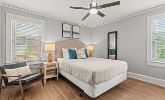 The bedroom to the right is our King room, featuring a King bed, nightstands, dresser, smart TV (no cable), and closet space.