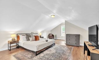 The attic contains an additional window unit for cooling the space. The spacious room contains a King bed and night stands, a small dresser and even a lovely armchair in a corner nook.
