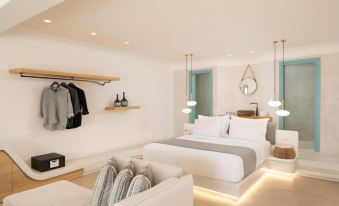 When we first arrived we were told we could only get water from our fridge in the room, which cost money, or from the market that was not within walkable distance. Later we found out there was a nice little market next door that sold water for much cheaper. Also we asked about the bus route, and the response was that the bus was no good and they would get us to where ever we needed ( costing 40 euros each way mind you) unless you wanted to go to Oia then it was 50 euros each way. They come off like they have a terrace, that is only if you get a certain room. No swim up bar, the bar is for the “restaurant, pool, and bar” all in one. It’s not worth it. They nickel and dime you. It would have been better to stay in Oia for the amount of money we had to spend on transportation. Also the “beach” that is walkable too, they don t even recommend That beach to go to. Other things came up like couldn’t get strawberry’s for breaks because they needed them for later that day,( it was on the menu) our room service was late because everyone else wanted breakfast in their rooms too. I wouldn’t go back.