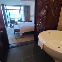 The first thing that attracted me to this hotel was the affordable prices compared to other nearby luxury hotels. It was definitely one of the better deals, and you get a very satisfactory stay in return. Everyone was very welcoming and helpful, including the front desk staff, bellhops, bartender, cleaning staff, waiters, and various other encountered staff (knowing a little Chinese helps). A staff member kept in contact with me through Wechat with its built-in translation tool, answering any questions, helping with any request, and making sure each day remained a satisfactory experience. I would like to give a special compliment to Zoey, the front desk staff member who was of great assistance; she deserves a promotion! Also, praise to the friendly and hardworking cleaning lady that is assigned to building 3, floor 5 (I don't know her name); she also deserves a bonus! The room itself is cozy, comfortable, and clean. Room service is smooth, it is very convenient to take care of any living necessities, and the pools and beach are a short walk away. There are no complaints that I have in regard to my stay. My biggest highlight is definitely the big bathtub! My only suggestion would be a single foldable lounge chair for the balcony, allowing for a person to lay down outside or for sunbathing, so it is not needed to always go to the public sunbathing areas.
