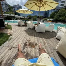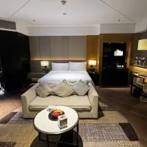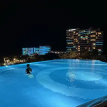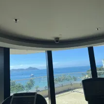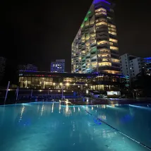 The hotel showed great attention to detail by providing face towels in the gym, which was a thoughtful touch. There are two swimming pools — one located on the gym floor and another outdoor pool that cleverly transforms into part of the bar area at night, which is a brilliant design.
