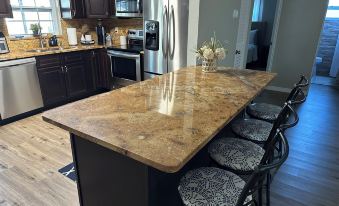 The expansive granite countertop offers plenty of room for both food preparation and dining, complete with four comfortable stools for a welcoming and versatile dining experience. Additionally, you can enjoy meals alfresco at the outdoor covered dining table, perfect for savoring the fresh air while you dine.