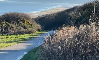 What are Dog & family friendly 2 bedroom sleeps 6, 10 mins walk to the beach nearby landmarks?