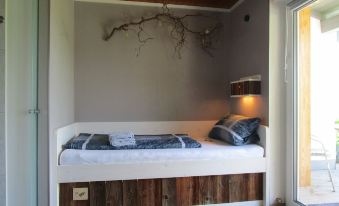 The second bedroom is furnished with a single bed (90 cm x 200 cm) and a sofa bed (140 cm x 200 cm). Due to the delimited wet room with shower and sink, the house is also suitable for several adults. There is also a second toilet in the corridor.