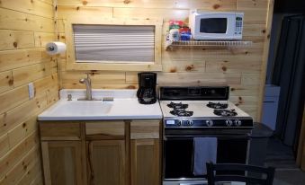 Each cabin is turnkey for a comfortable stay, and includes the following: Plastic plates, silverware, cooking utensils, pots, pans, salt, pepper, pizza pan, pizza cutter, bacon splatter guard, can opener, corkscrew, aluminum foil, paper towels, dish soap, dish strainer, dish towels, electric frying pan, real coffee, coffee pot, real creamer, coffee mugs, toaster, microwave, and spare rags.