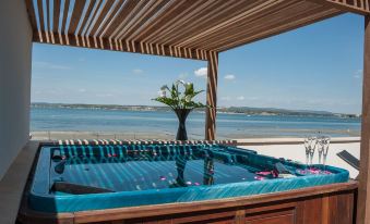 - 1 large wooden deck with a spa overlooking the lagoon (6 seats) (with direct access to the beach), garden furniture, deckchair