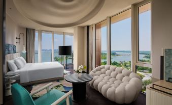 房間大,挑高高,風格清朗。床品舒適,燈光設計合理。推薦陽台房。我們訂的豪華精品湖景陽台房,兩面玻璃,環湖視野極佳,要是陽台上能放把椅子就更好。獨立衣帽間很大。浴缸和沖淋在一起,也有一個小陽台。不過看得出一些裝飾細節略粗糙,比如脱膠,還有不太理解為何椅子有很多擦傷的痕跡。