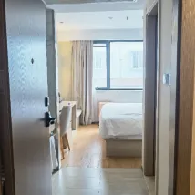 The room was a bit small but well-equipped, though it felt a little dusty. Its location is very convenient, just one traffic light away from the subway station, with plenty of local eateries nearby. Breakfast is delivered directly to your room since there's no on-site restaurant. A washing machine was available, but we didn't end up using it. The service was excellent, and coffee and other beverages are also available in the lobby.