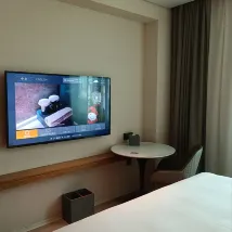 We booked this hotel while visiting Wujiaochang with my child. It's quite a new hotel. On the ground floor, they offer complimentary tea, porridge, and some fresh fruit. The elevators are key-card operated for security. Overall, the room was decent. I especially appreciated that the shower had strong water pressure and no leaks. The toiletries were all verbena-scented, and the provided toothpaste was excellent. The room was advertised to have a smart assistant, but it could only play music, not control the curtains or lights.
