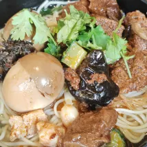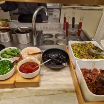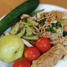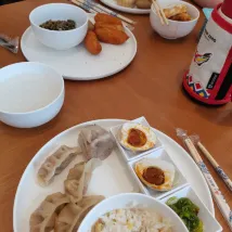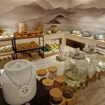 The fruit selection was very limited – no watermelon or oranges, only cherry tomatoes, small plums, and fragrant pears. There weren't many tasty dishes either. Only the soup noodles had a fresh and savory broth.