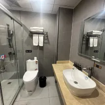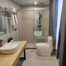 The room is spacious, bright, and well-equipped. The bathroom is separated into wet and dry areas. It has its own parking lot, which makes parking convenient. There are also charging piles, which are very friendly to new energy sources. The service attitude of the hotel staff is also good. It was a very good stay experience.